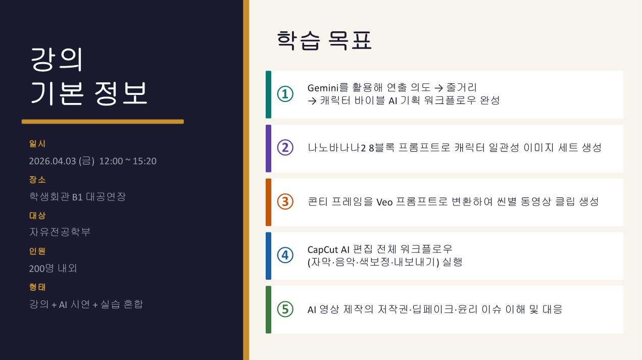 공지 2026-1 새잎창의세미나 특강 : 스마트폰을 활용한 영상 콘텐츠 제작기초교육 <AI 하이브리드 영상 제작 특강>